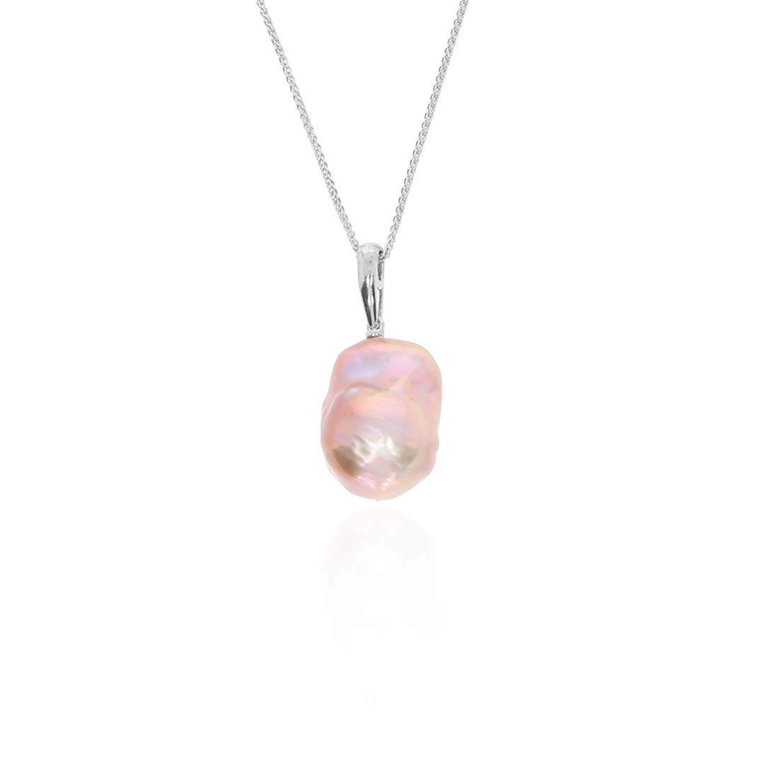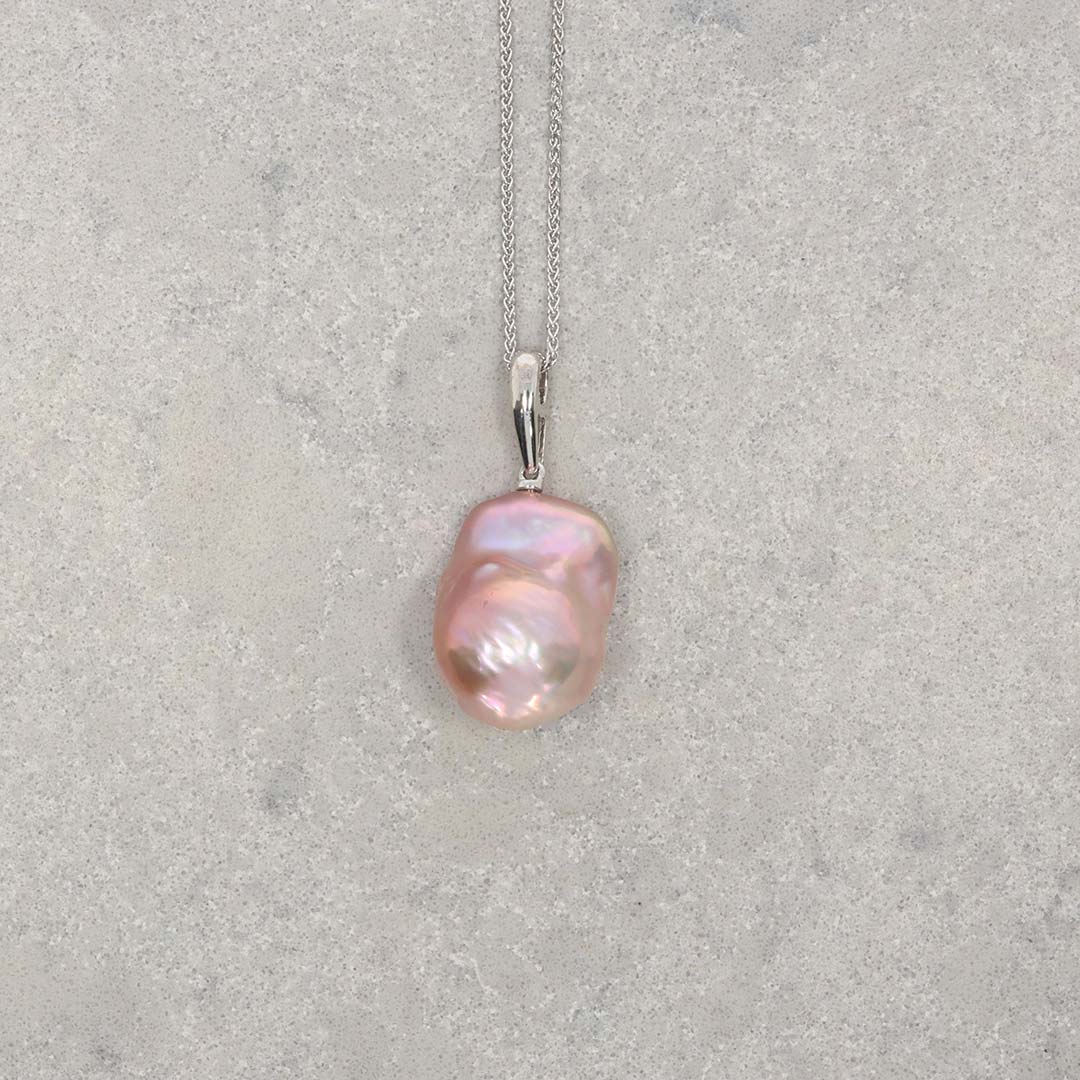 A pink Baroque Cultured Pearl (approx. 14mm) pendant in 18ct white Gold. Baroque pearls offer a unique, imperfect beauty.