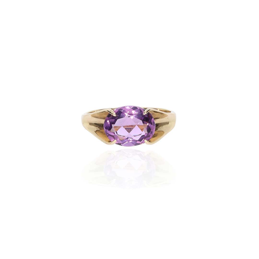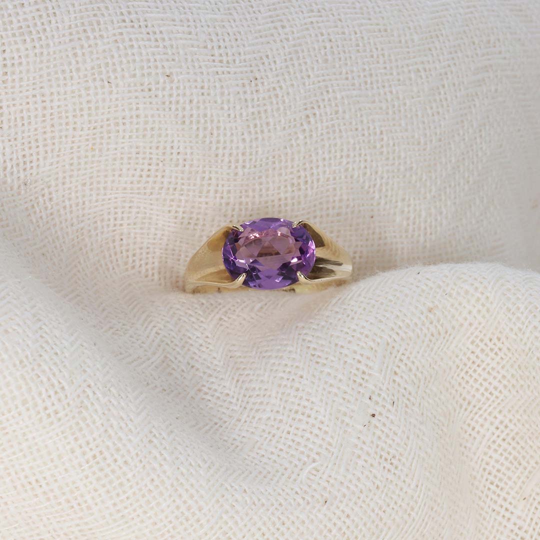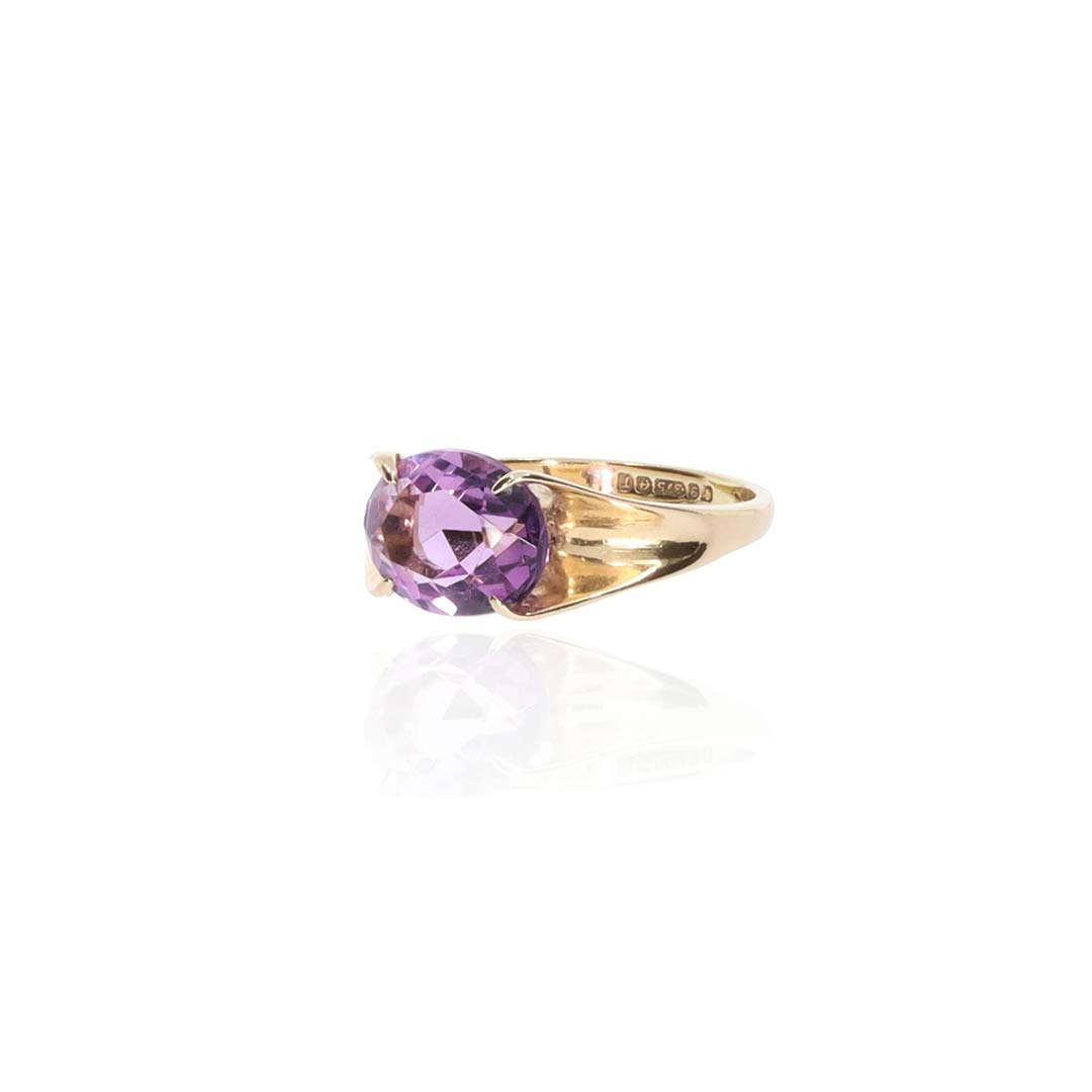A preloved Amethyst oval claw set ring made in 9ct yellow Gold.