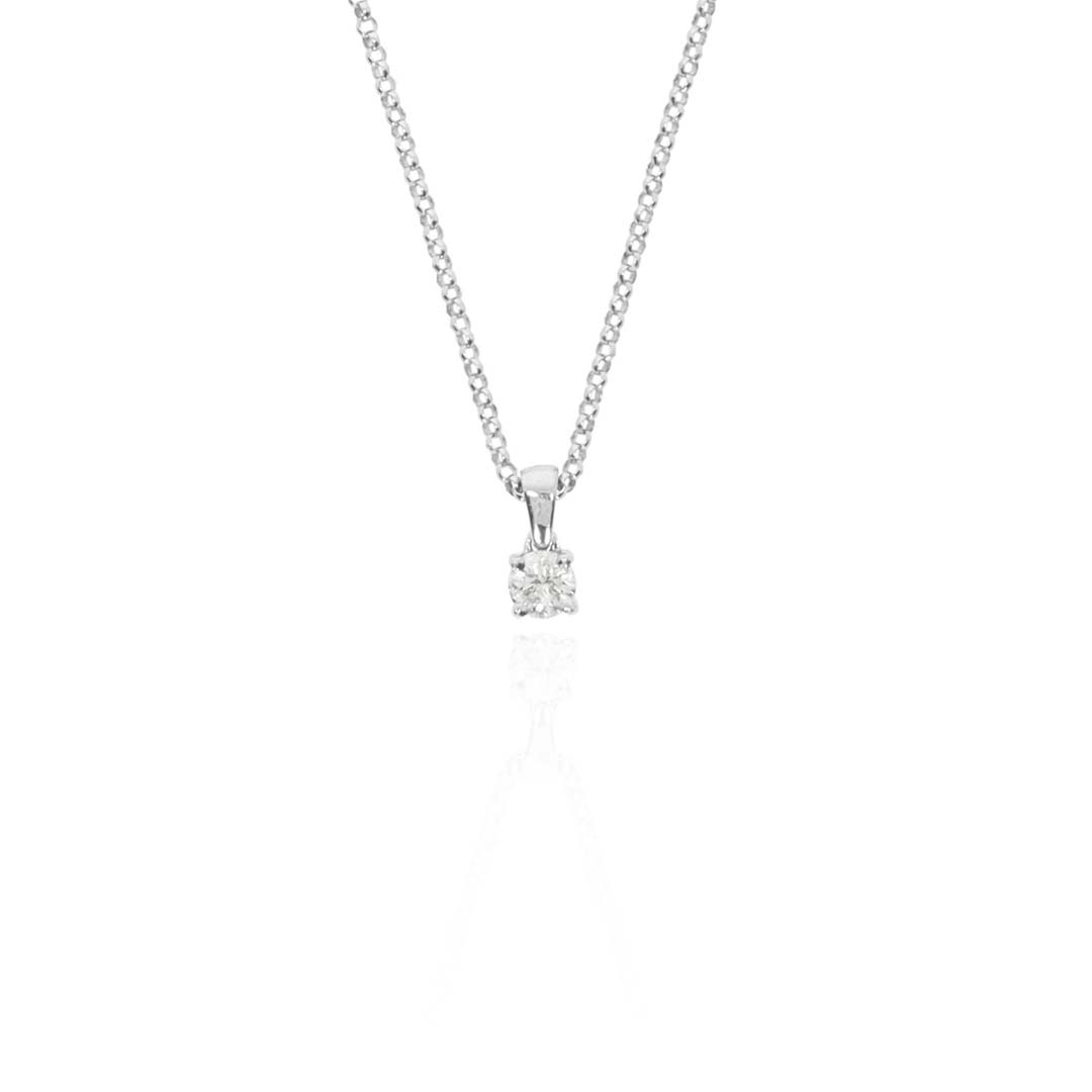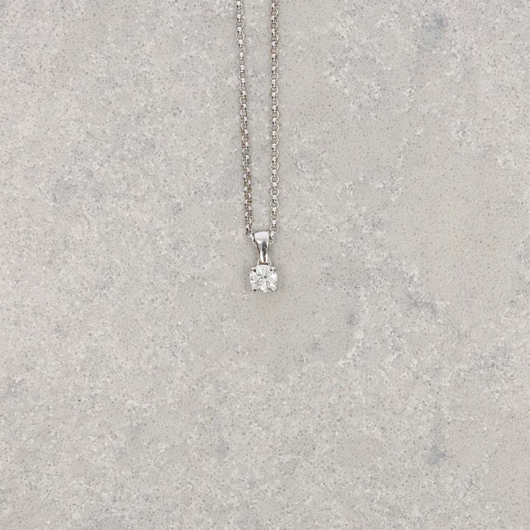 A round brilliant cut Diamond (approx. 0.15cts, 3.3 X 3.3mm) solitaire claw set pendant, including a 9ct white Gold 16″ trace chain.