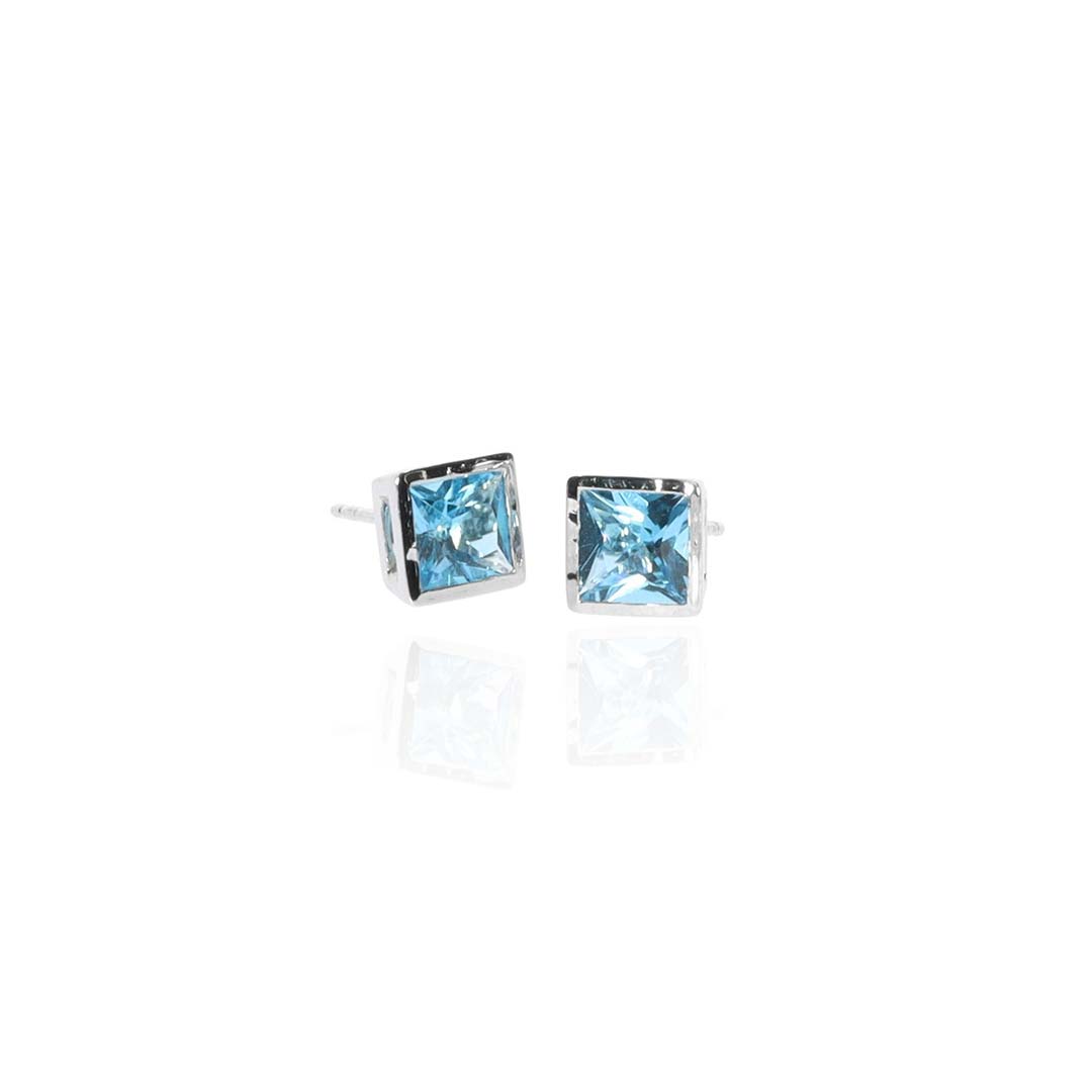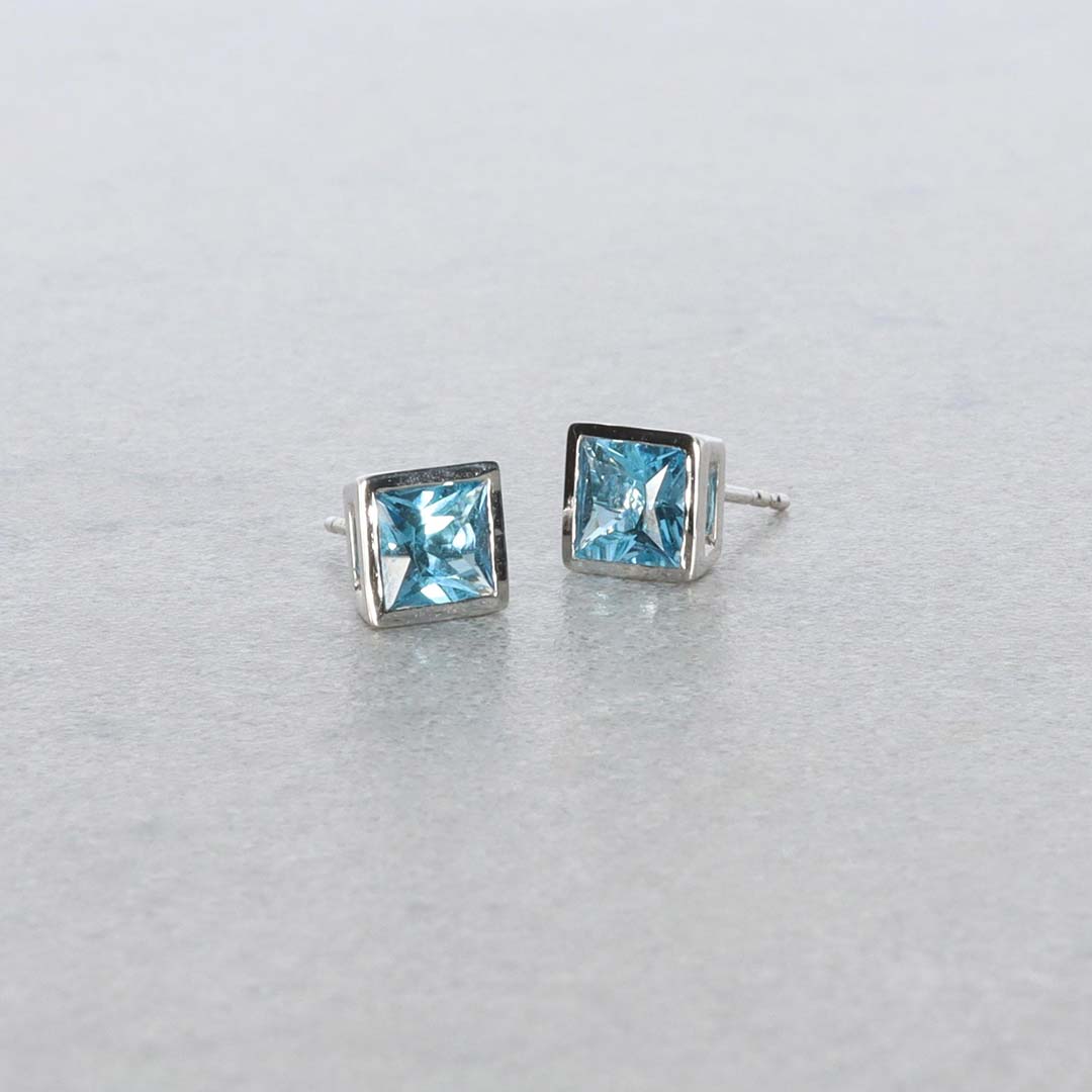 A pair of square shaped enhanced Blue Topaz (approx. 1.26ct) 9ct white Gold rub over earrings.