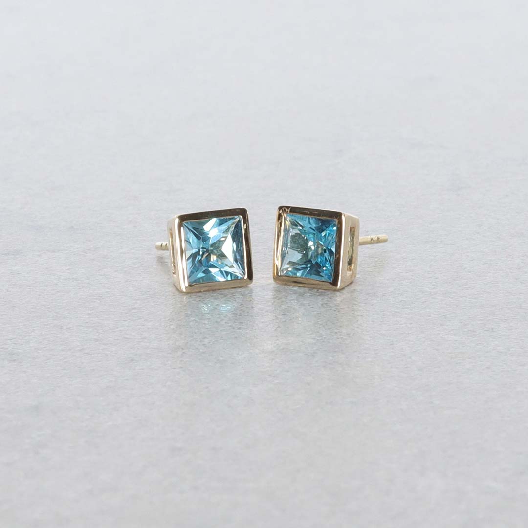 A pair of square shaped enhanced Blue Topaz (approx. 1.39ct) 9ct yellow Gold rub over earrings.
