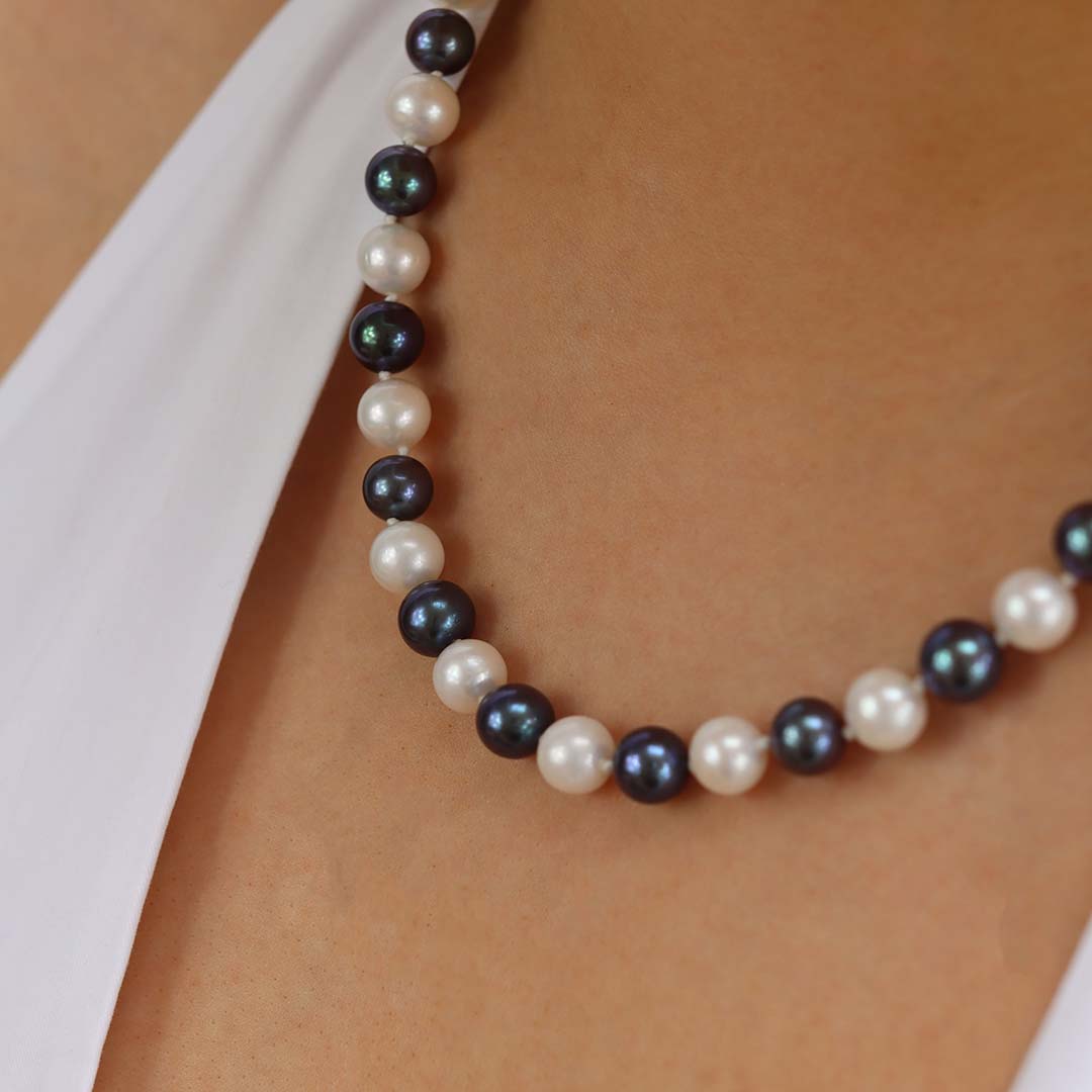 A stunning Black and White Cultured Pearl (approx. 9mm) and 9ct yellow Gold necklace makes an elegant statement, teamed with black or white Cultured Pearl earrings.