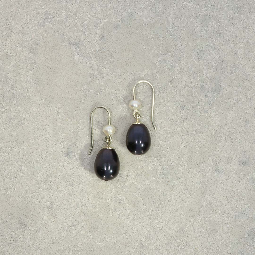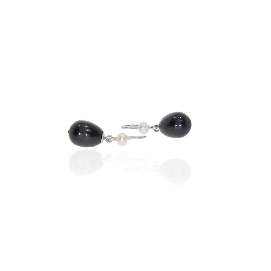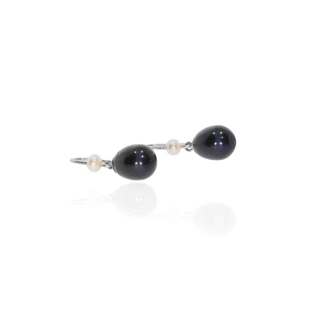 A pair of black freshwater Pearl (9 x 7.6mm) drop earrings with small seed Pearls made in 9ct white Gold. Gross weight approx. 2.2g. Overall length approx. 23mm