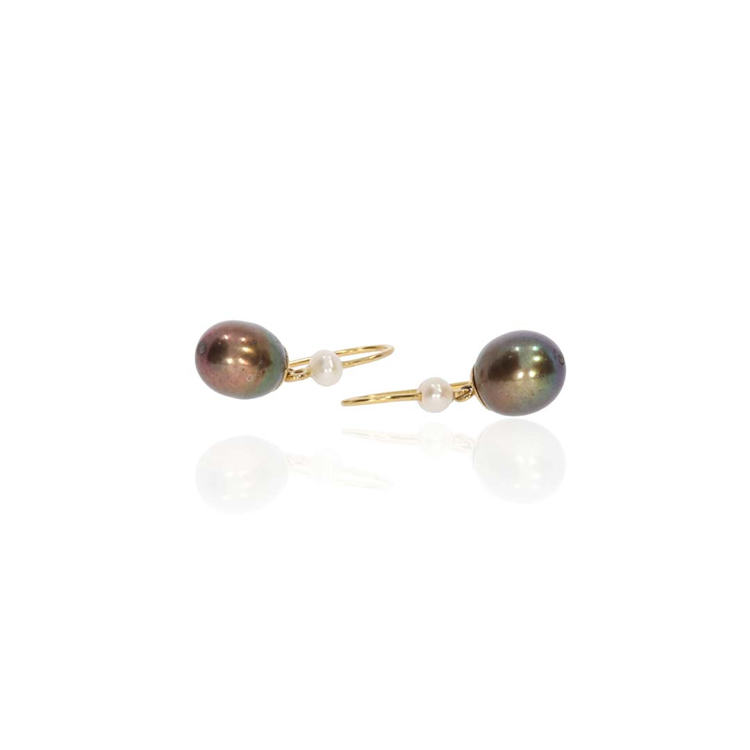 A pretty pair of black freshwater Pearl (9 x 7.6mm) drop earrings with small seed Pearls on 9ct yellow Gold shepherd hooks.