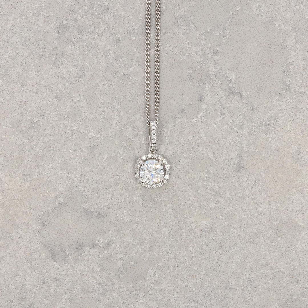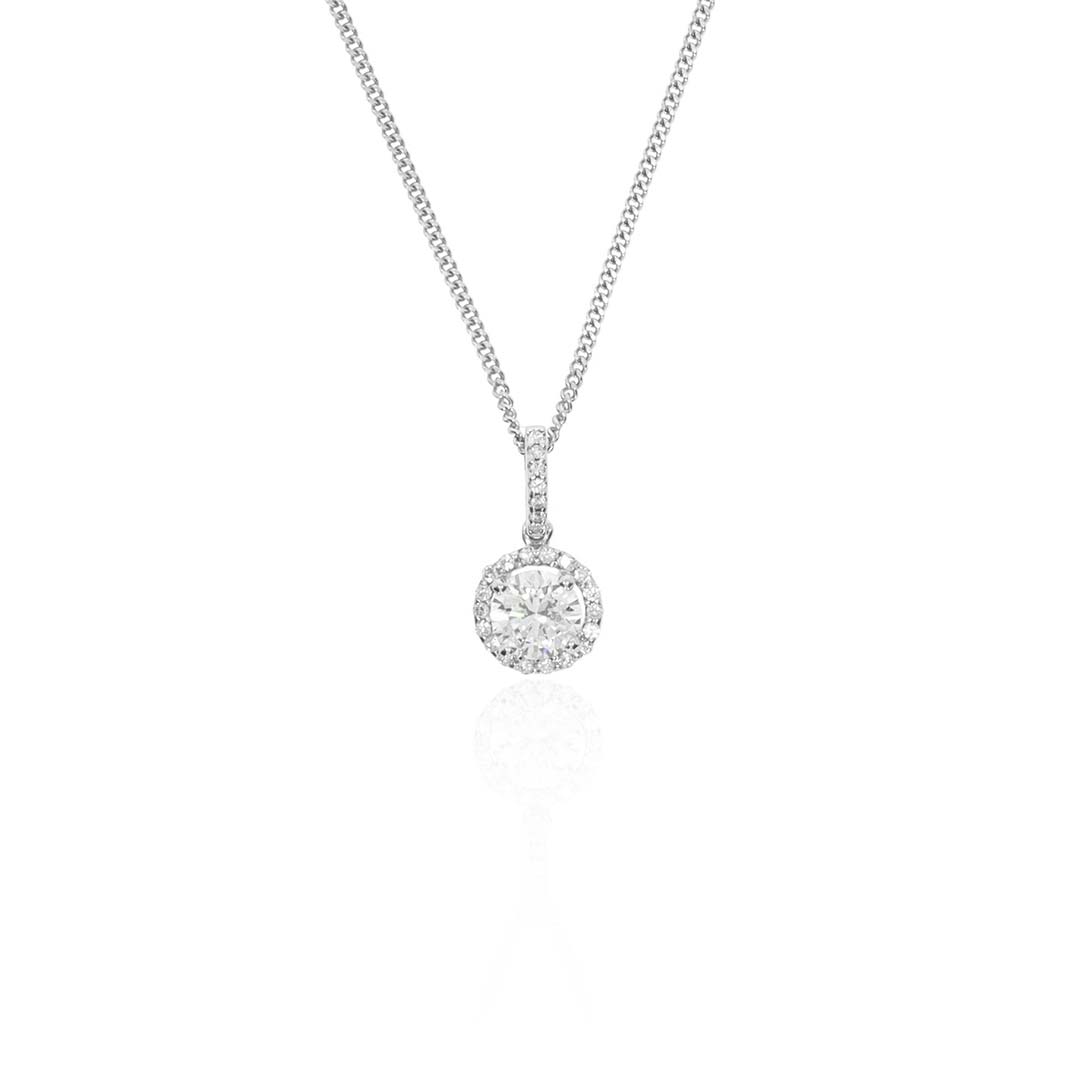 A stunning round brilliant cut GIA certificated Diamond G/VS2 (approx.0.65cts) is surrounded by sparkling brilliant cut Diamonds (approx. 0.18cts) set exquisitely in 18ct white gold.