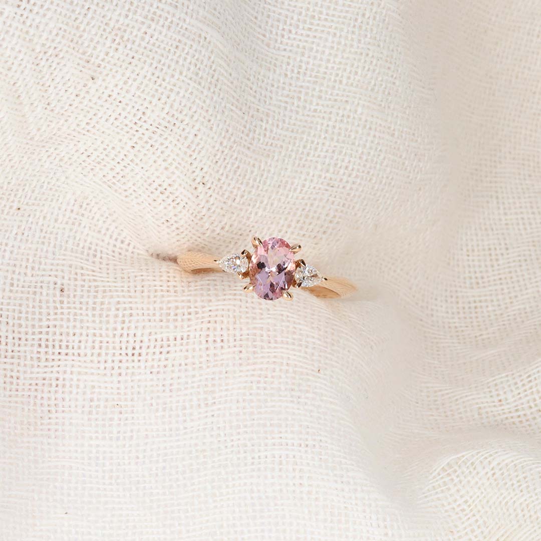 A radiant oval Morganite (approx. 0.62cts, 6.6 x 4.9mm) and pear shaped Diamond (approx. 0.17cts, 3.6 x 2.3mm) three stone ring made in 18ct Rose gold. The gemstone’s gentle beauty and warm colors evoke feelings of charm and grace.