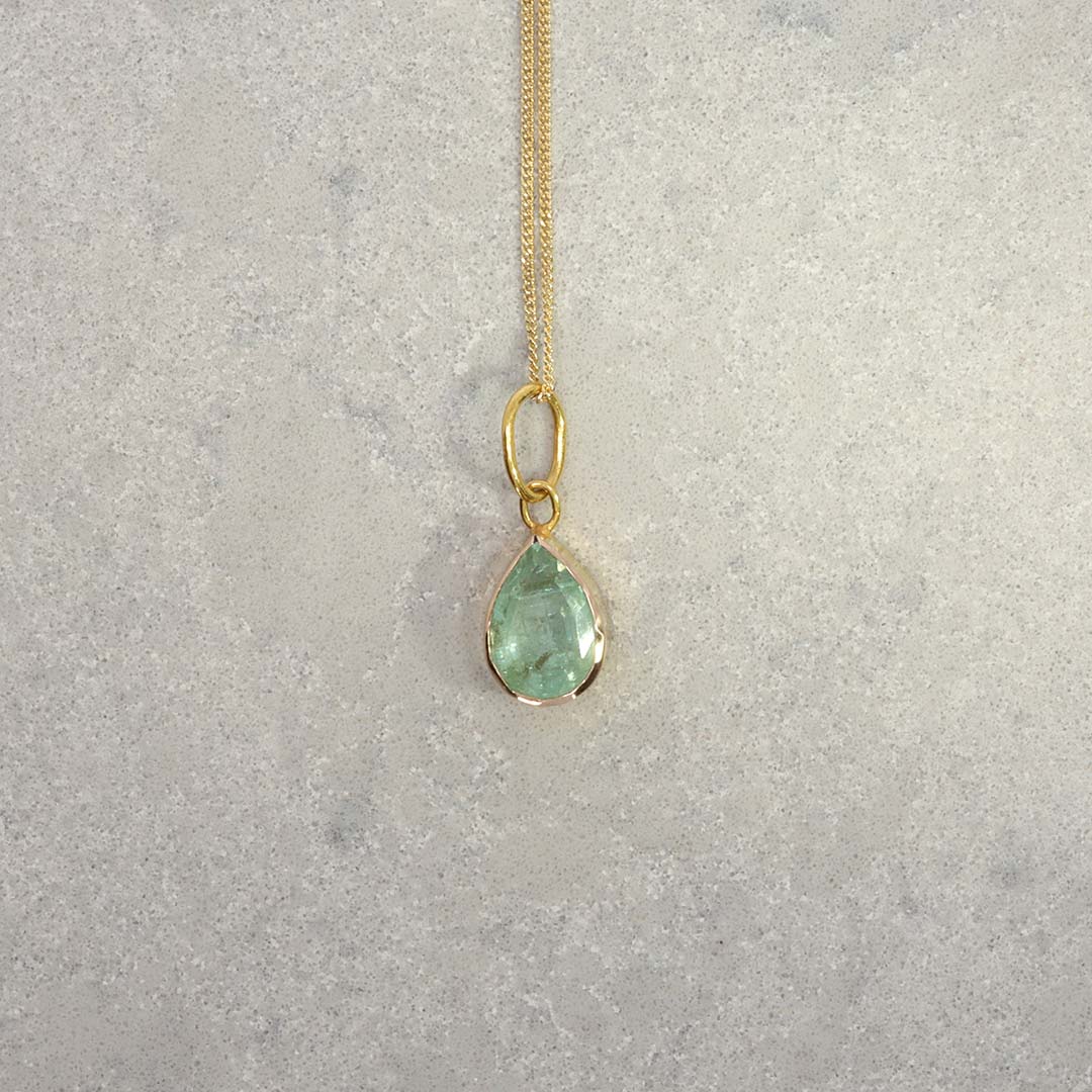 A bold and striking Emerald pear shaped (approx.12.5 x 9mm) pendant in 18ct yellow Gold.