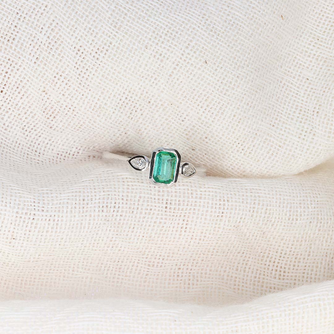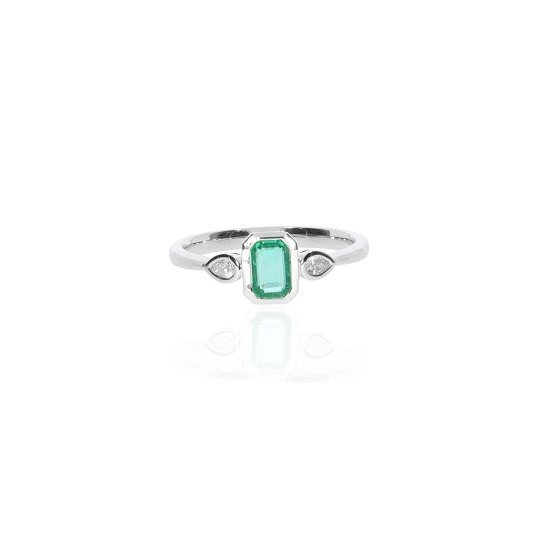 A captivating natural Emerald (approx. 0.51cts, 5.5 x 4.2mm) and pear shaped Diamond (approx. 0.10cts, 3 x 1.7mm) rub over set ring made in 18ct white Gold.