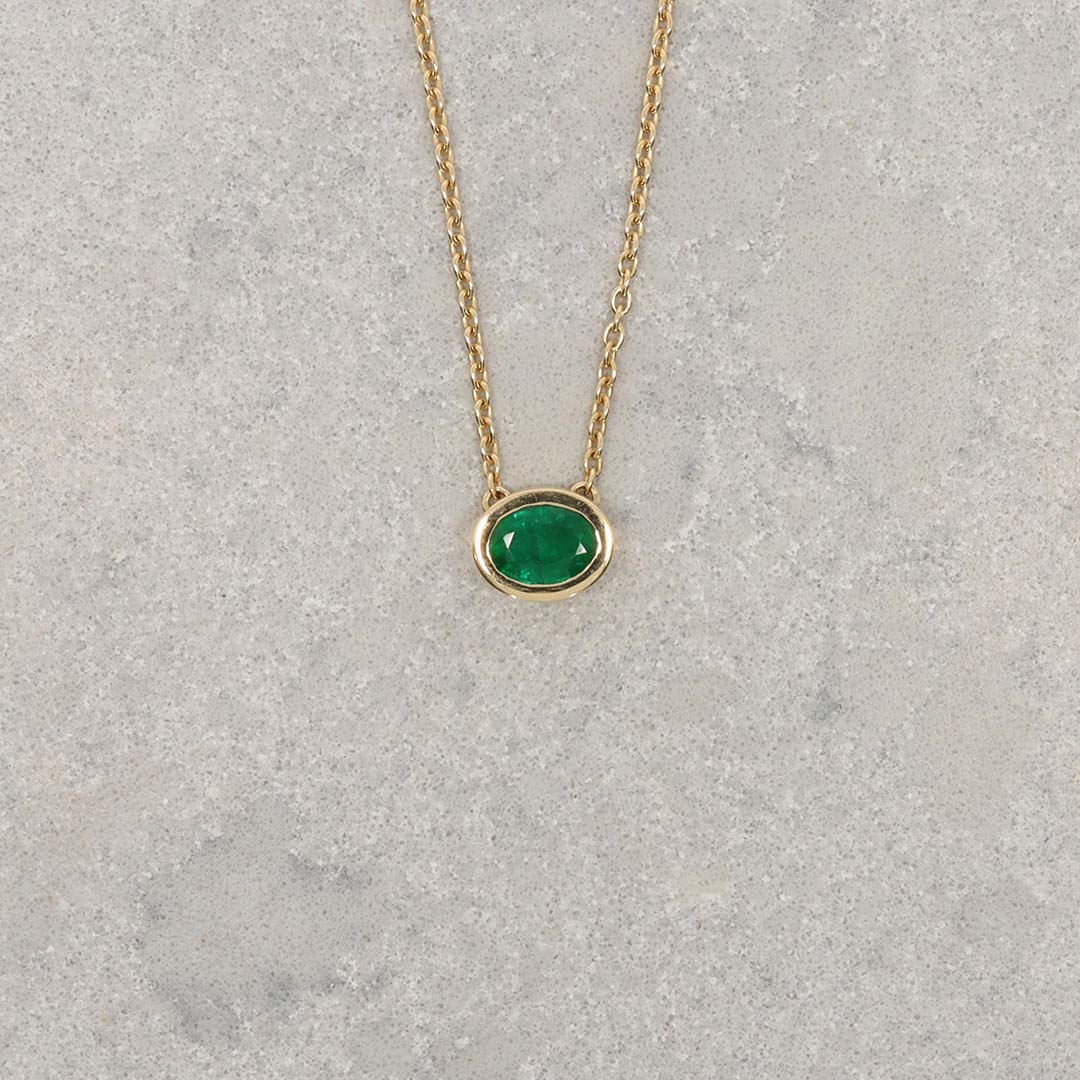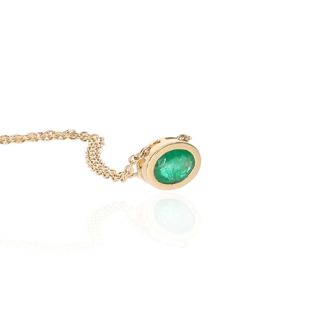 An vivid intense green oval mixed cut Emerald (0.87cts) pendant made in 18ct yellow Gold with an adjustable trace chain (16-18″).