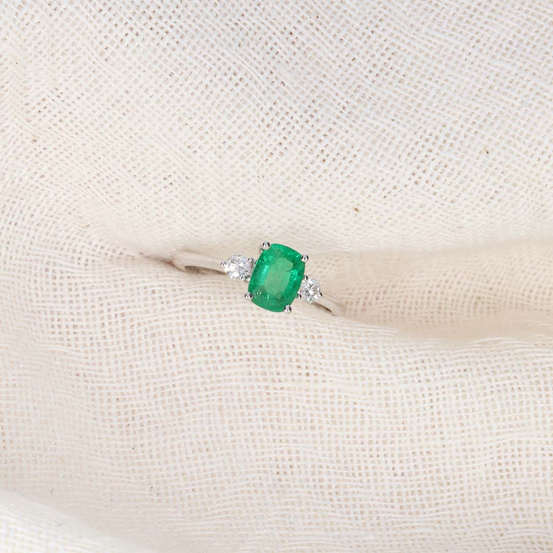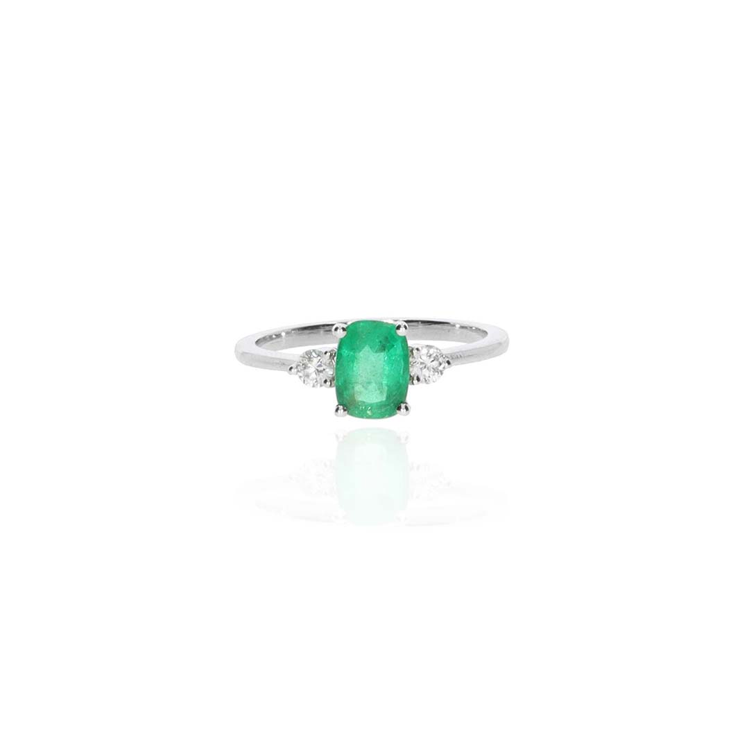 A rich green Emerald (approx. 0.92cts, 6.6 x 5.3mm) and Diamond (approx. 0.16cts, 2.7mm) three stone claw set ring made in 18ct white Gold, is timeless.