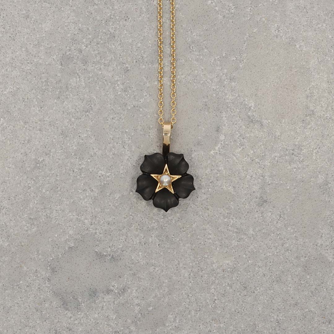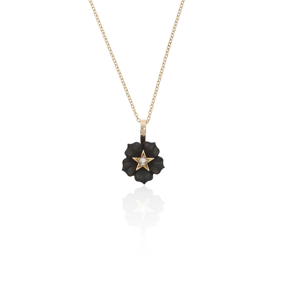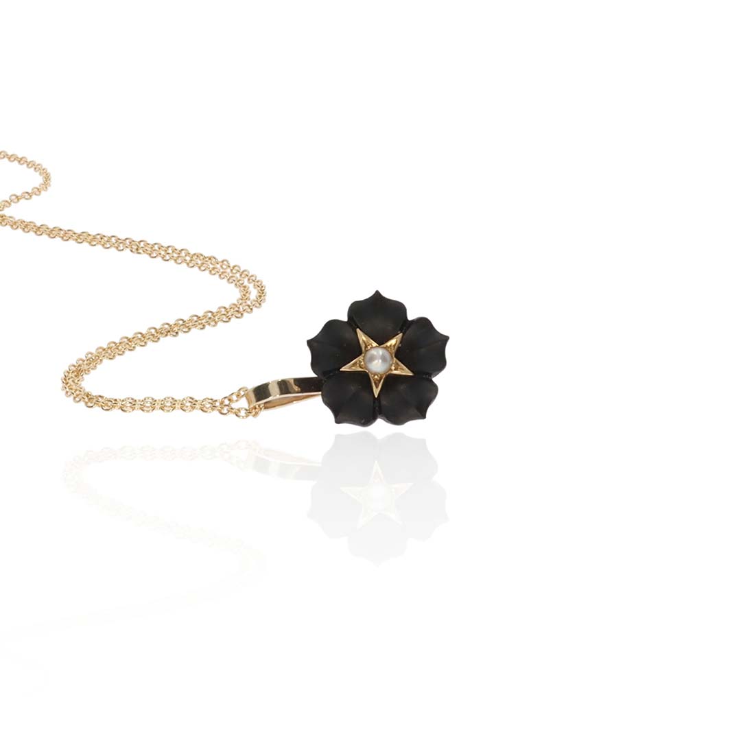 A bold black Onyx and Pearl “flower” pendant made in 9ct yellow Gold, makes a stunning addition.