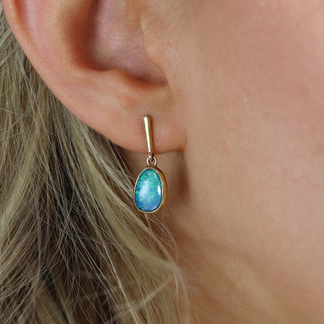 A pair of shimmering Opal doublets drop earrings made in 9ct yellow Gold. Gross weight approx. 2.5g Overall length approx. 2.5cm NB: Doublets should not be allowed to become wet as the layers may split apart.
