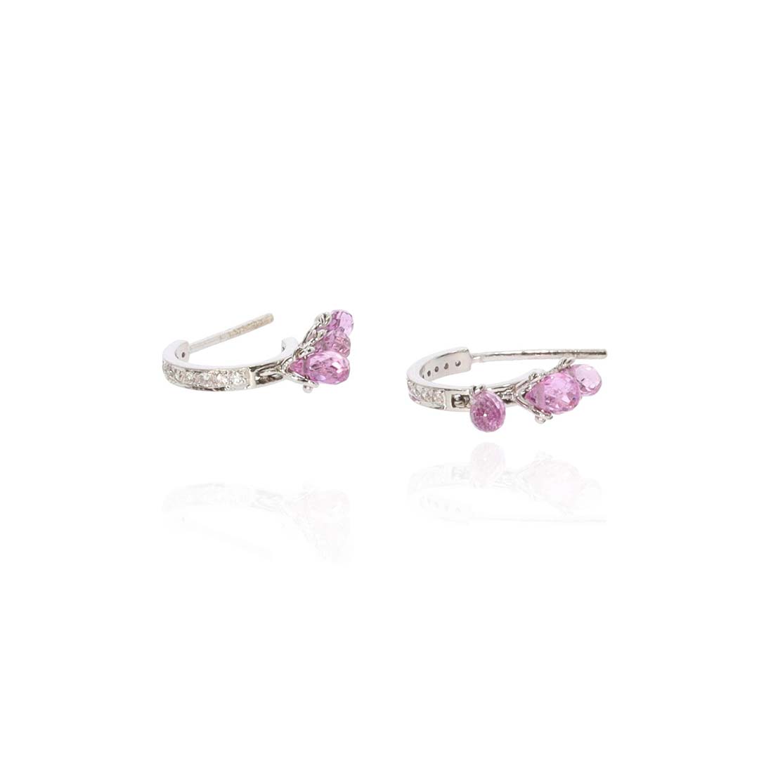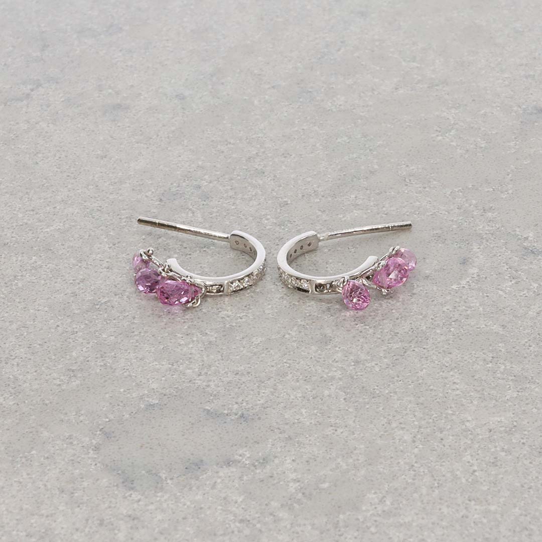A pair of pink Sapphire briolette drop (approx. 2.38cts) and Diamond (approx. 0.20cts) hoop earrings made in 18ct white Gold.