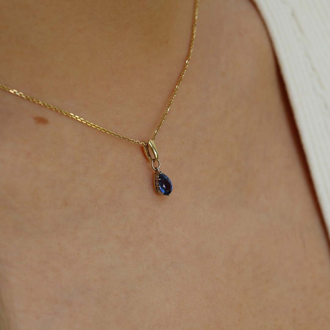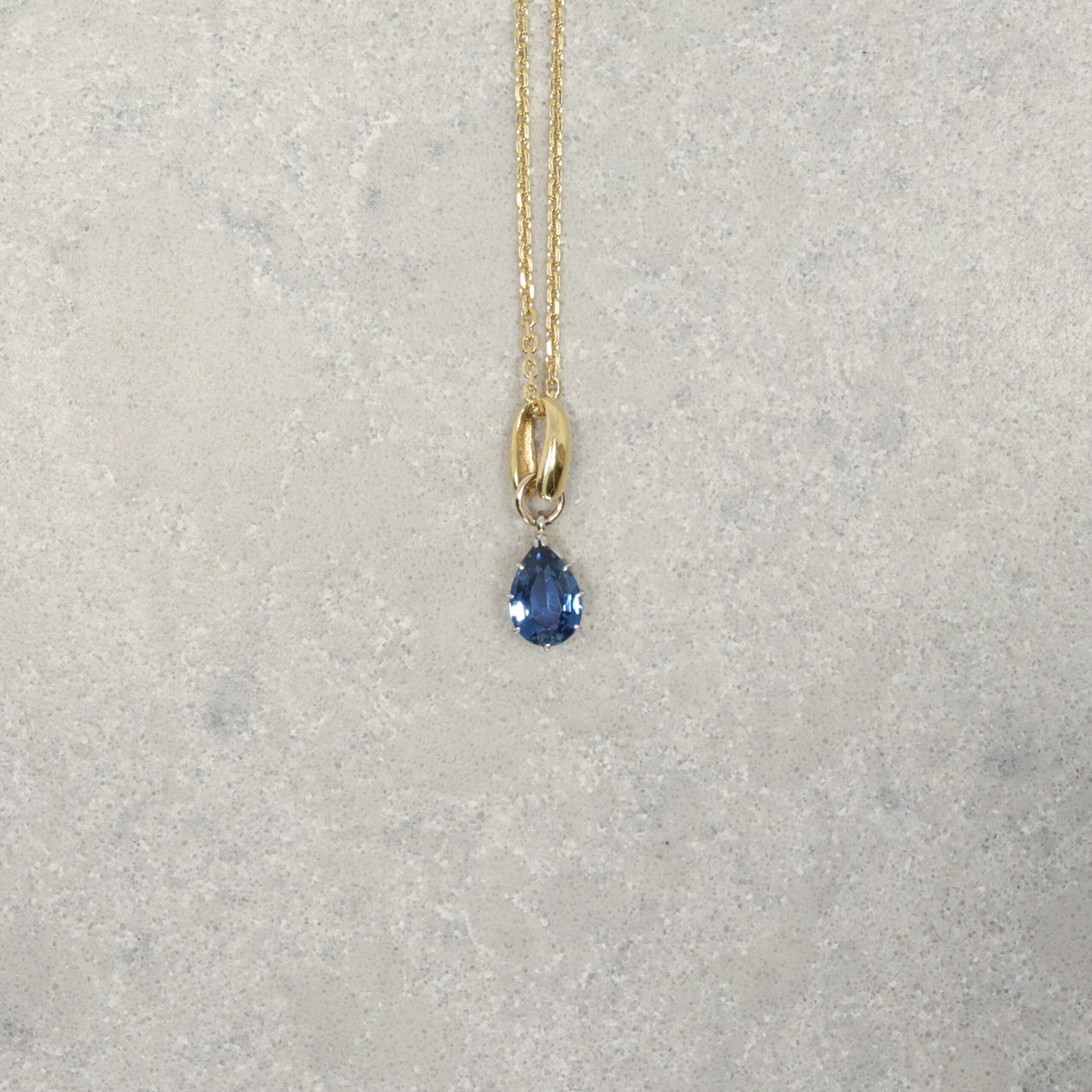 A beautiful deep blue pear shaped Sapphire (measuring approx. 7 x 5mm, approx. 1.00cts) drop pendant made in 18ct yellow Gold with articulating bail. Gross weight approx. 1.0g Overall measurement approx. 17 x 5mm