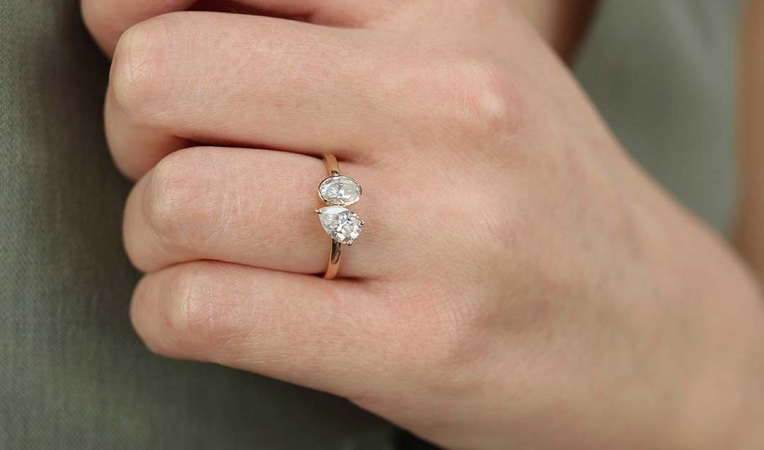 A delightful Moissanite (approx. 1.18cts total, D/VS1) oval (approx. 6x4mm) bezel set and pear shaped (approx. 7x5mm) claw set 9ct yellow gold ring.